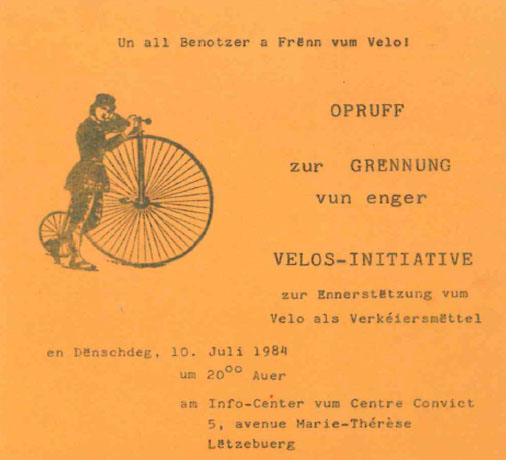On October 4, 1984, a bicycle demonstration organized by the Luxembourg-city section of the Mouvement Ecologique took place in Luxembourg. This demonstration was the first step in the foundation of our organization, which is known today as ProVelo.lu.